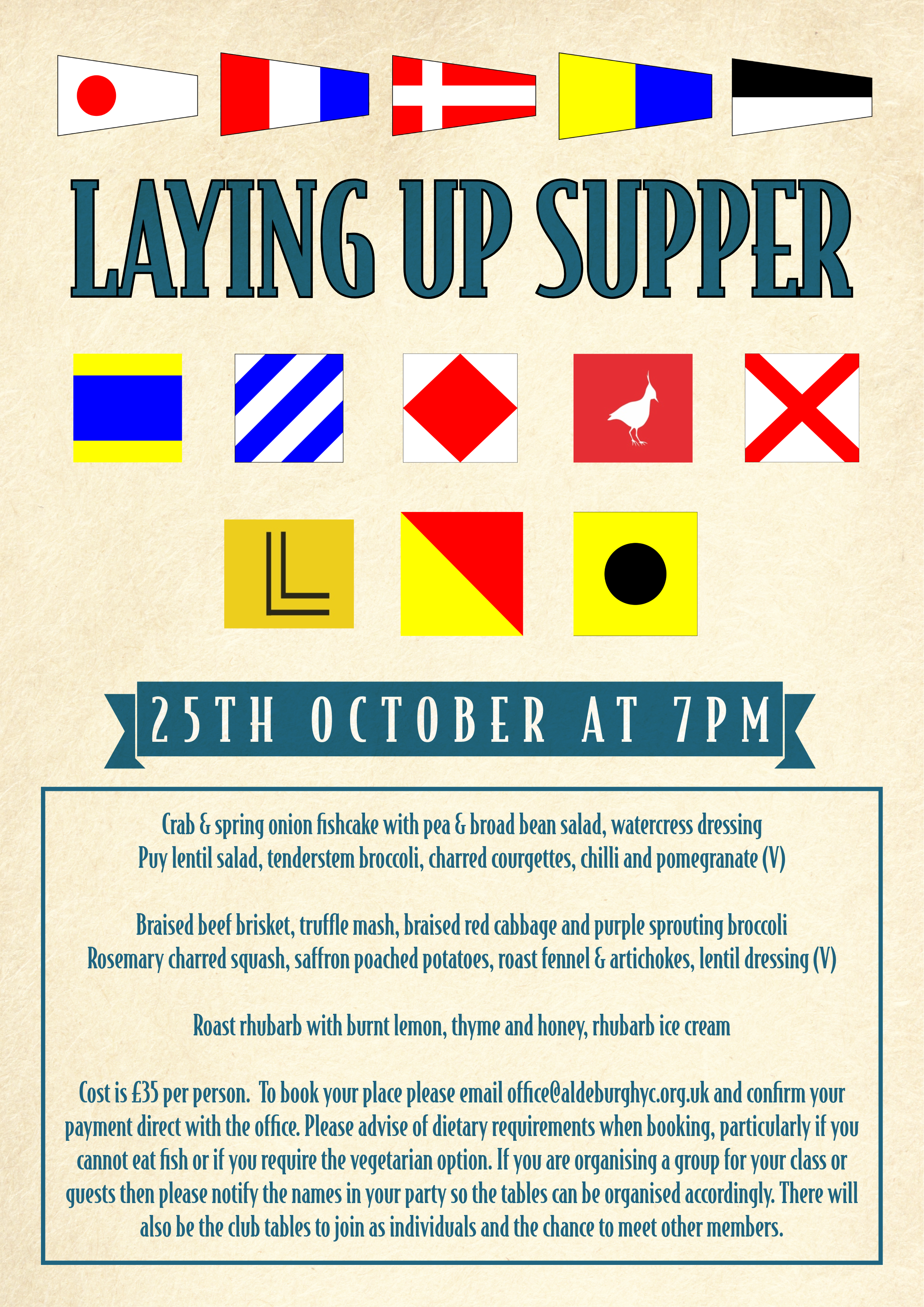 A celebration of the end of the sailing season. Please book via office@aldeburghyc.org.uk and let us know of any dietary requirements when booking. It's £35 per head, please make payment when you book. If you're organising a group, please let us know the names of those who will be on your table. There will also be Club tables for you to join.