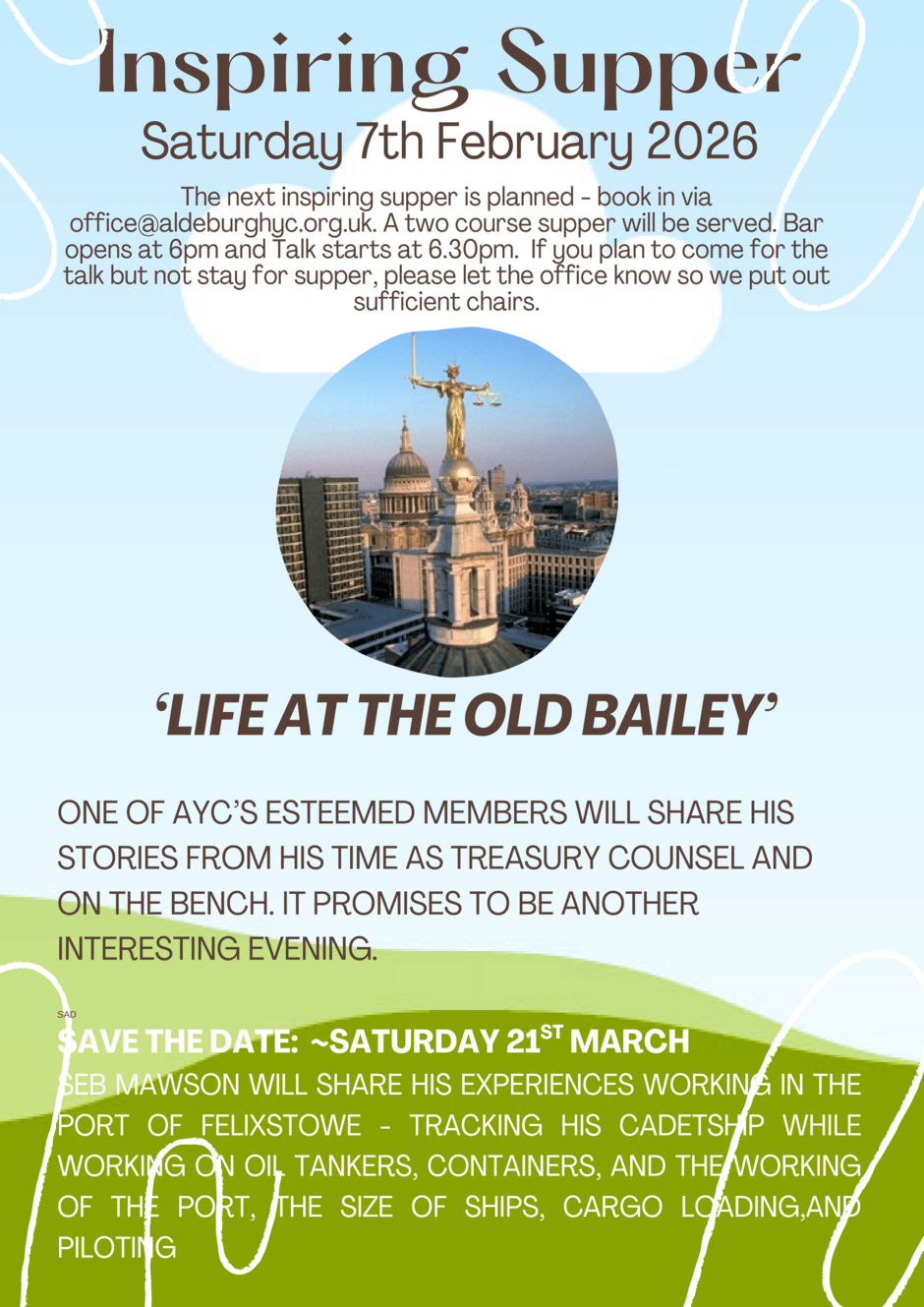 Please book via office@aldeburghyc.org.uk and let the office know of any dietary requirements.